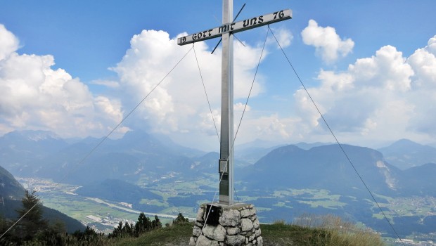 Nach einiger Zeit wird der Wald heller und die Aussicht auf das Inntal entschädigt etwas für die recht lange Steigung durch den Wald. Jetzt ist es nicht mehr allzu weit, dennoch zieht sich der Weg etwas hin. Zuletzt folgen wir zwischen Latschen hindurch bis zum Gipfelkreuz des Köglhörndl mit sehr guter Aussicht auf Inntal, Pendling, Kaisergebirge mit Pyramidenspitze, Feldberg, Stripsenkopf, Scheffauer, Ellmauer Halt etc. bis hin zum Großglockner und Venediger uvm. Auch eine gemütliche Holzbank lädt zur längeren Rast ein.